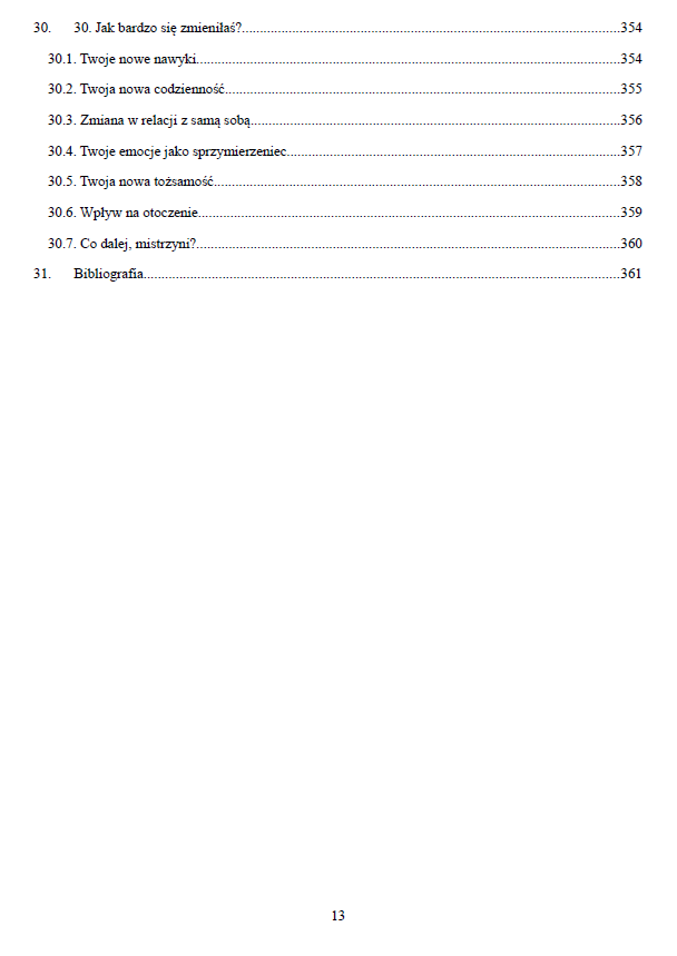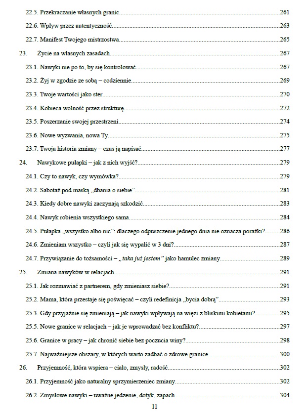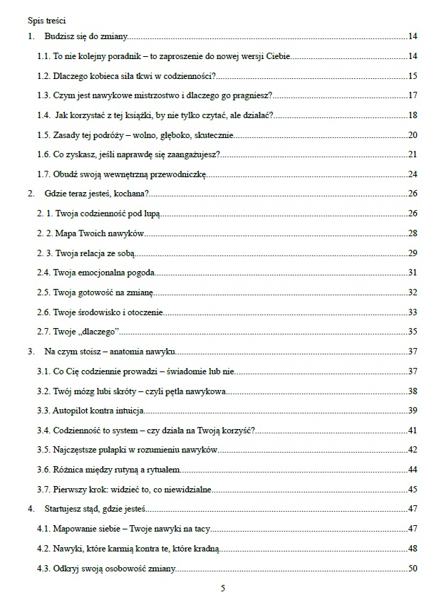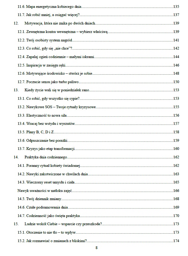W kursoksiążce znajdziesz przemyślane narzędzia wspierające zmianę – od mikro nawyków działających w tle po strategie samokontroli i kreatywne metody celebrowania każdego małego kroku. Autorka tłumaczy mechanizmy działania nawyków, pokazuje, jak unikać efektu kosztów utopionych i zmęczenia decyzyjnego, a także jak skutecznie zastępować stare wzorce nowymi – z uważnością, łagodnością i kobiecą siłą.