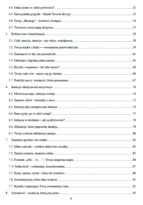 To osobista podróż do większej sprawczości i równowagi, prowadzona krok po kroku. Autorka zaprasza do rozpoczęcia procesu, który nie polega na wymuszonym wysiłku, ale na świadomym wyborze i praktyce – w zgodzie ze sobą i własnym rytmem.