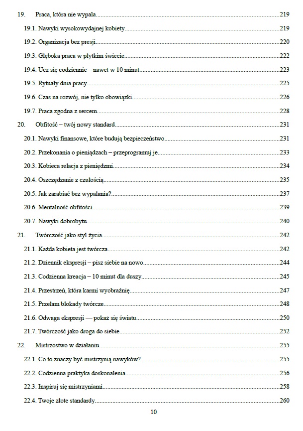 „Nawykowe mistrzostwo, czyli jak skutecznie zmieniać nawyki” to kursoksiążka stworzona specjalnie dla kobiet pragnących wprowadzać świadome, trwałe zmiany w swoim życiu. To nie tylko teoria psychologiczna, ale przede wszystkim praktyczny zestaw ćwiczeń opartych na inspirujących wpisach blogowych z cataleja.pl, gdzie autorka regularnie dzieli się wiedzą o budowaniu prostych, codziennych nawyków oraz metodach pracy nad prokrastynacją, samodyscypliną i rutyną poranną lub wieczorną.
