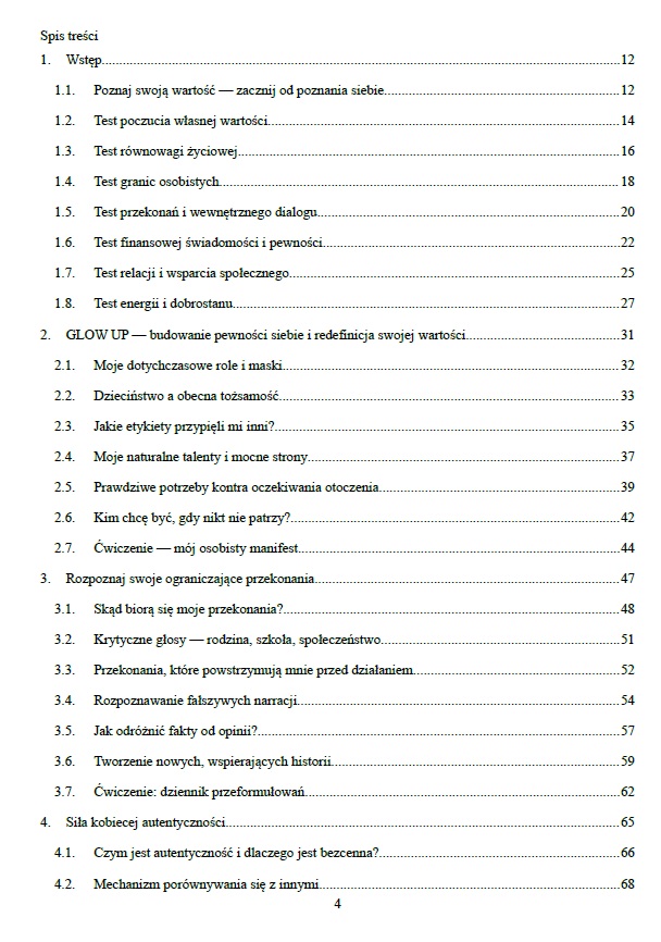 To nie jest kolejna książka motywacyjna. To mapa powrotu do siebie — swojej wartości, odwagi i niezależności. Ta książka to kompleksowy przewodnik dla kobiet, które chcą przestać się dopasowywać, zadowalać innych i żyć „na pół gwizdka”. Jeśli czujesz, że masz w sobie więcej potencjału, niż pokazuje Twoja codzienność — jesteś w idealnym miejscu.Krok po kroku przejdziesz przez proces GLOW UP: