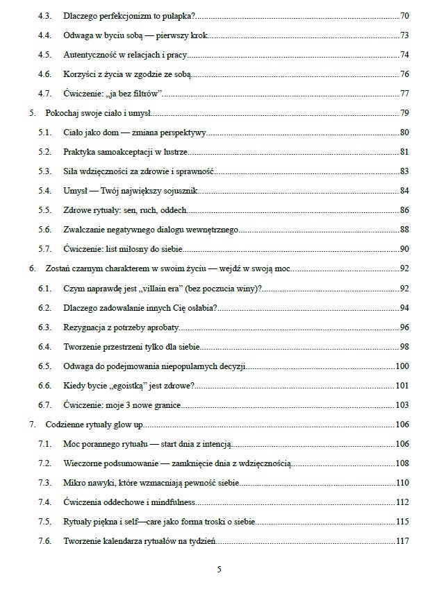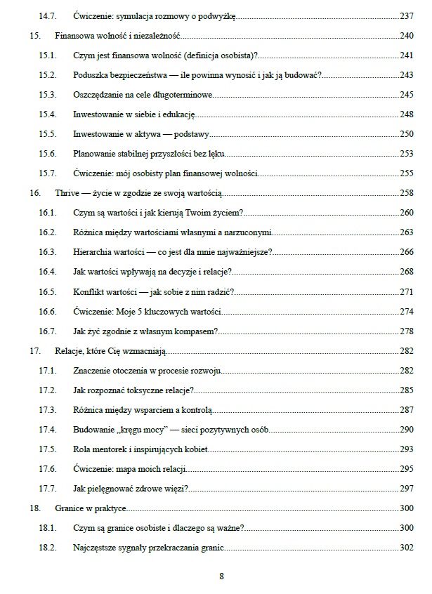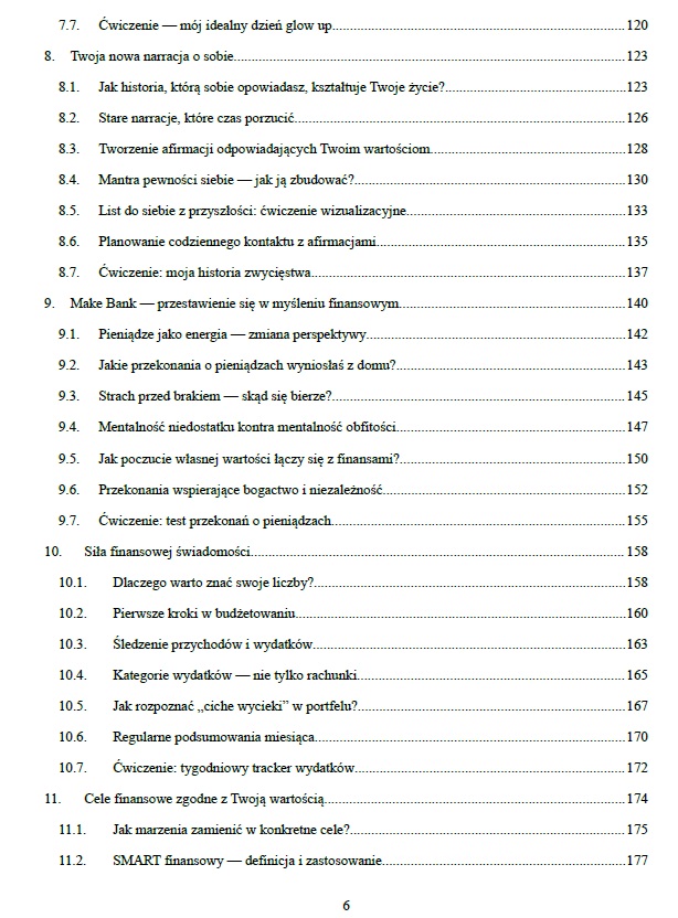 Ta książka łączy rozwój osobisty, mindset, pracę z ciałem i emocjami oraz praktyczne podejście do pieniędzy — bez presji perfekcji i bez duchowego bełkotu. W środku znajdziesz m.in.: